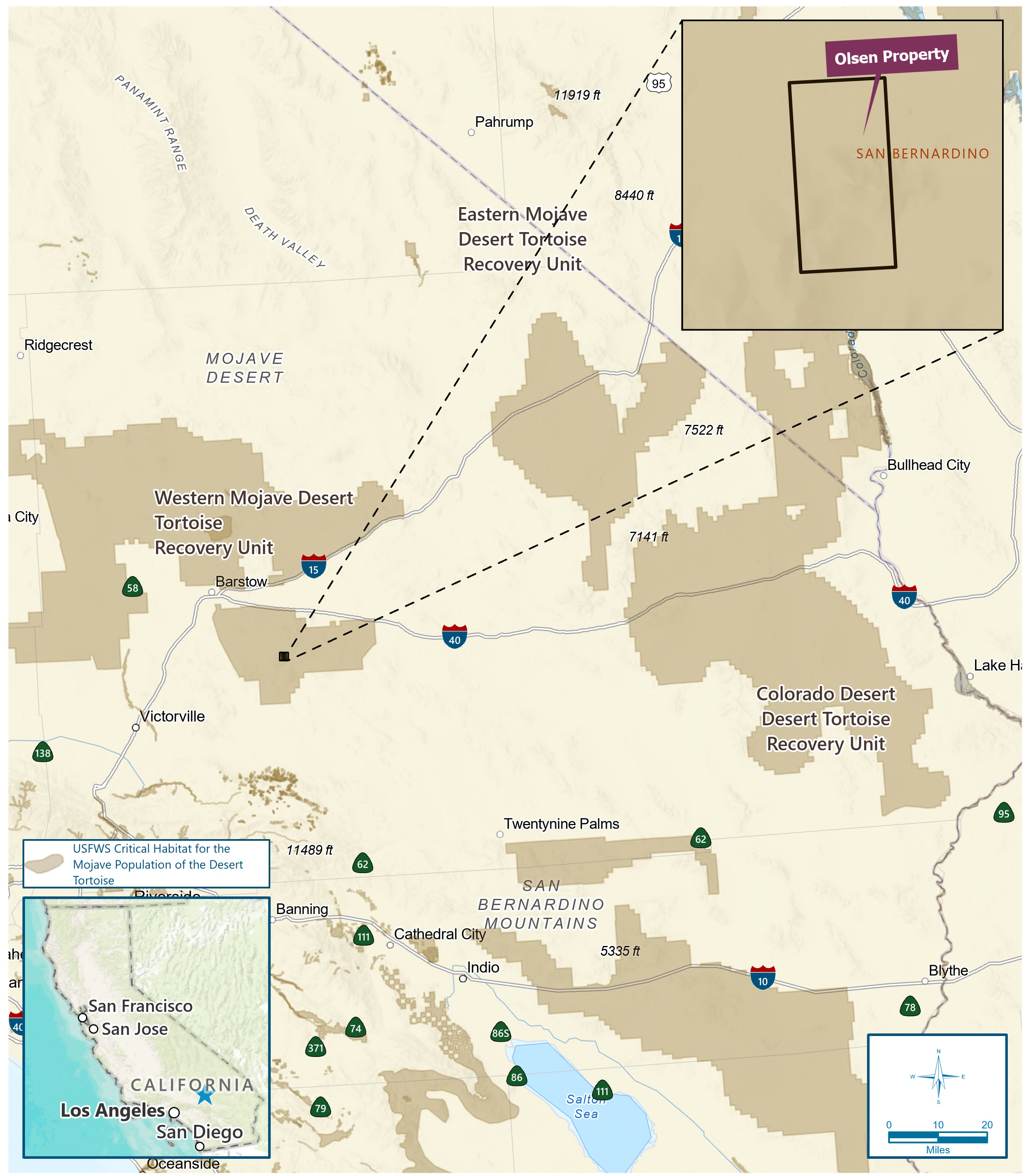 DownloadThe Olsen Desert Tortoise Full Delivery/ Turnkey Mitigation site is a pending conservation bank designed to offer off-site compensatory mitigation for projects that impact the Mojave desert tortoise, desert wash habitat, and wildlife corridors. Strategically located within the Western Mojave Desert Tortoise Recovery Unit, the site is positioned to play a vital role in advancing the recovery of the federally threatened Mojave desert tortoise (Gopherus agassizii), a species of critical concern to both the U.S. Fish and Wildlife Service and California Department of Fish and Wildlife.