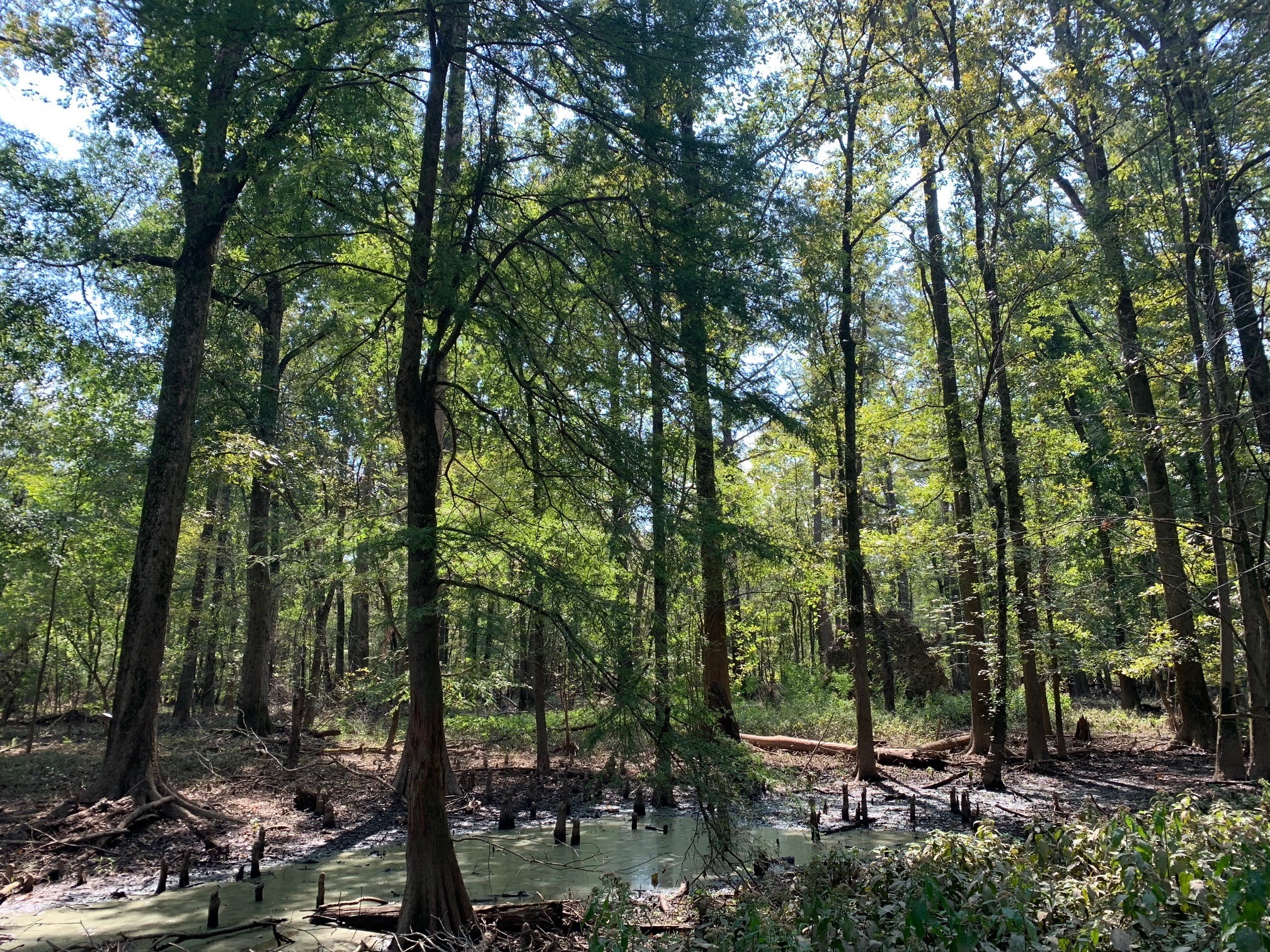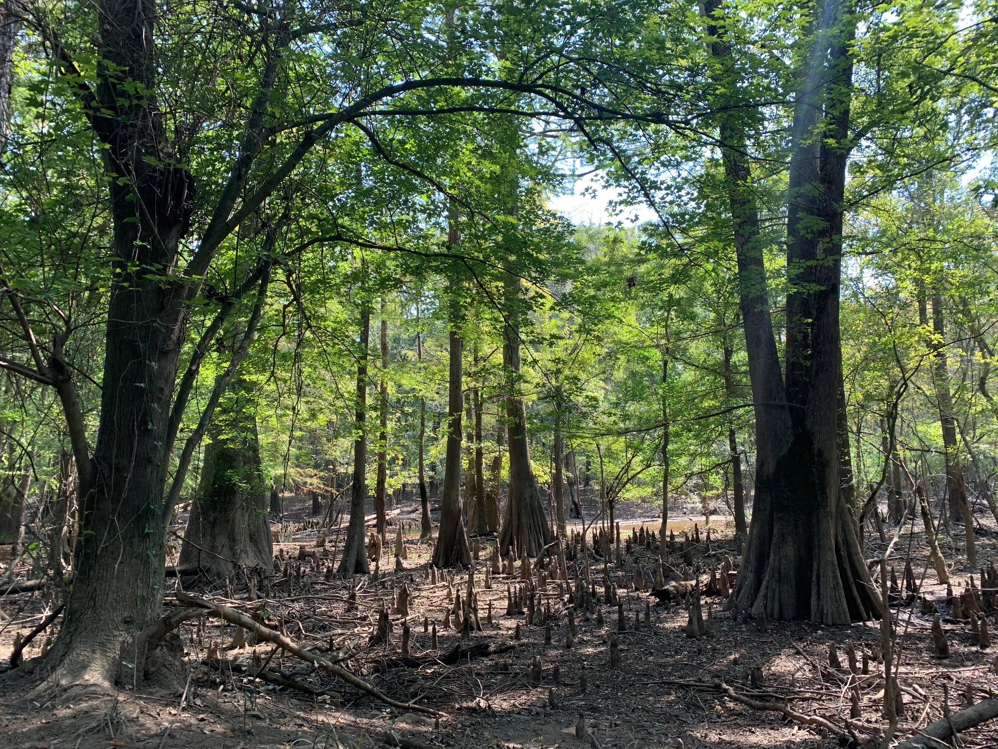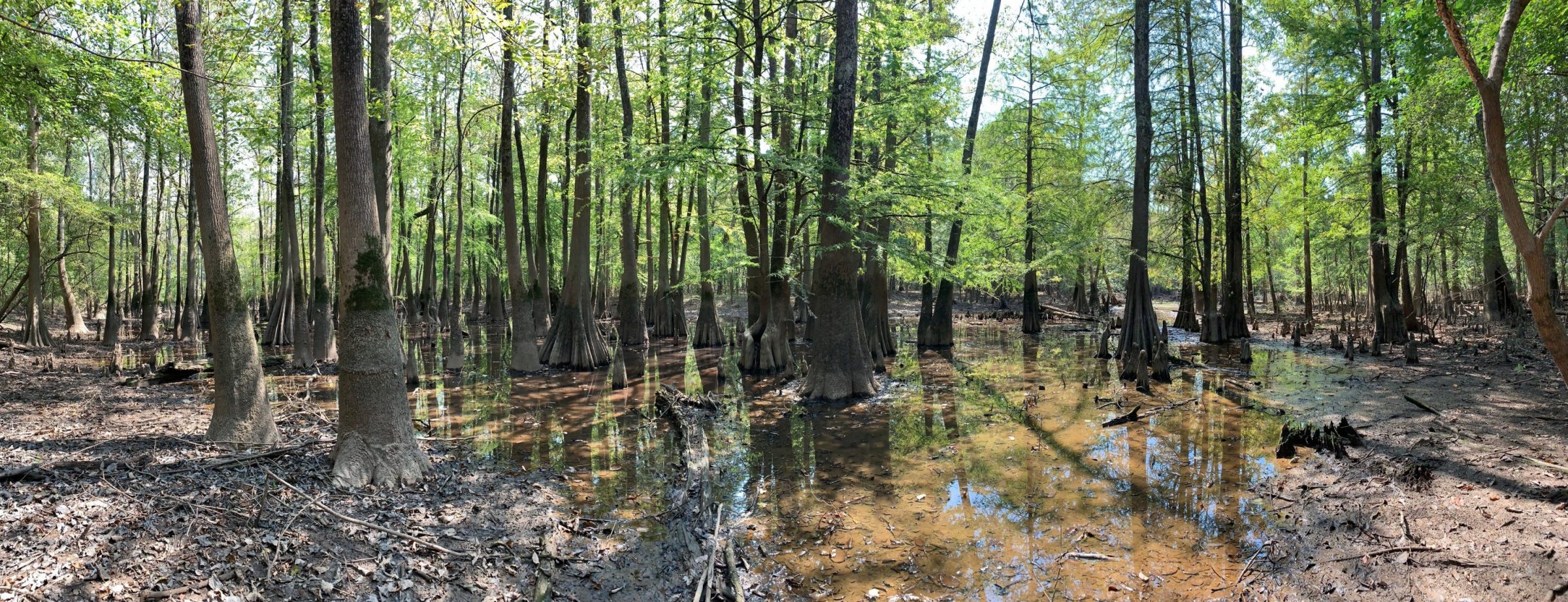 Tull Wooten II. Bald cypress trees and bald cypress knees in wetland areas. Standing water, algae, sediment deposits are all present.